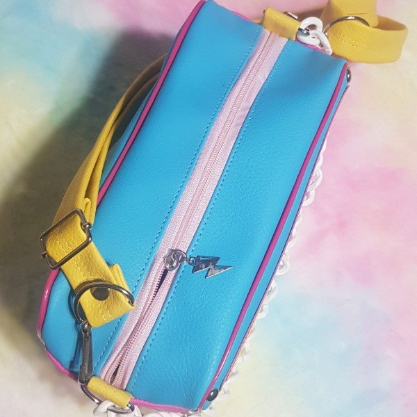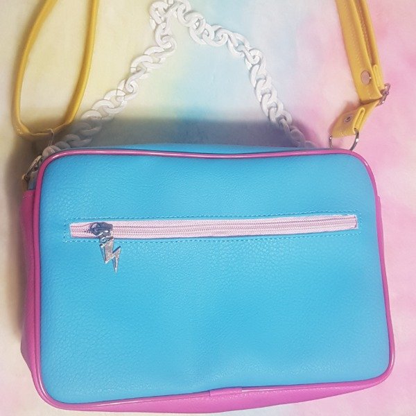 Posee un bolsillo plaqué con cierre en la parte trasera, y correa con sistema de mosquetones, que permite usarla como cartera de mano o de hombro.
