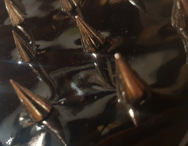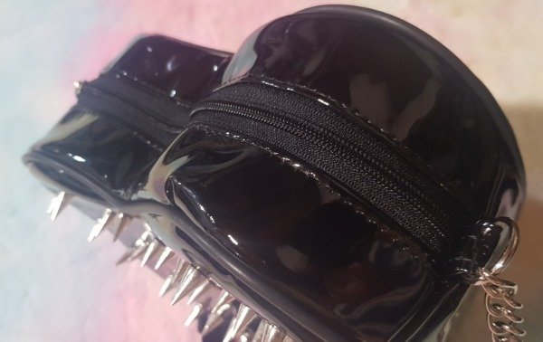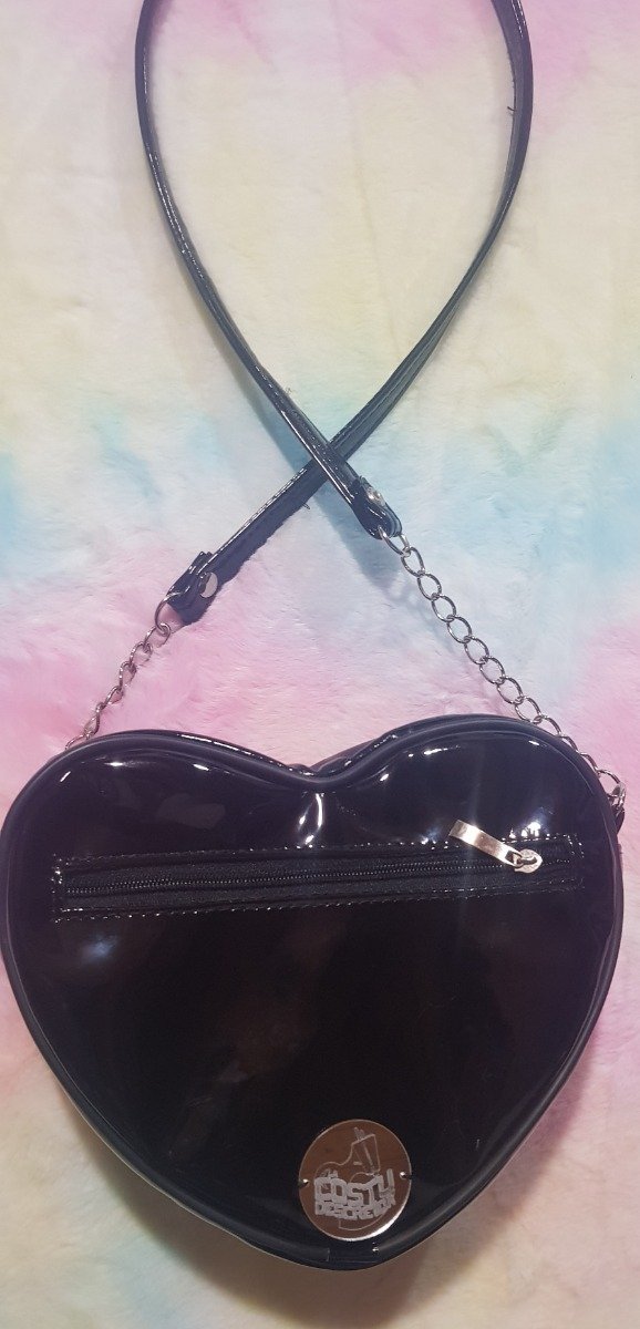 Cartera confeccionada integramente en charol negro. Con correa mixta, cadena y charol. Con bolsillo trasero. Y forrada en tafeta negra.