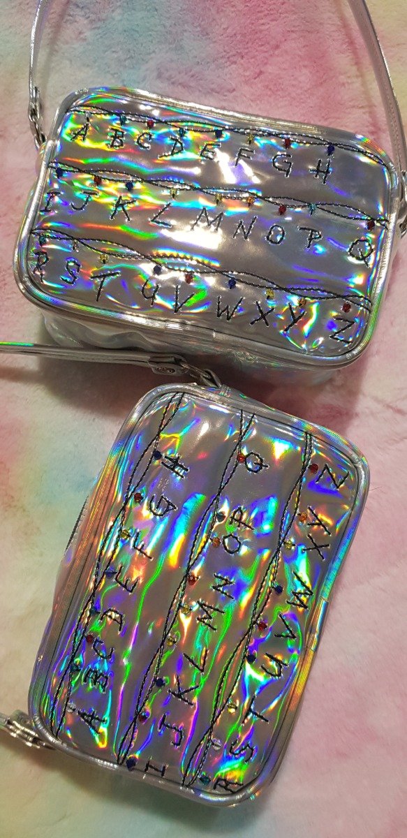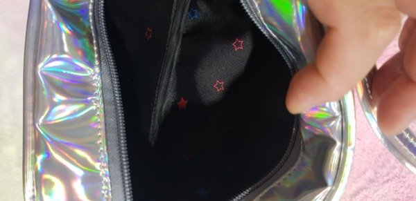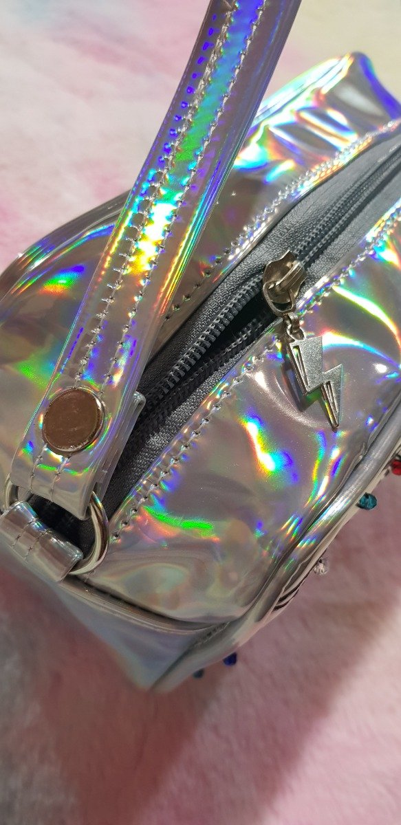 Cartera confeccionada integramente en cuerina holográfica, reforzada con friselina, y forrada con raso estampado.