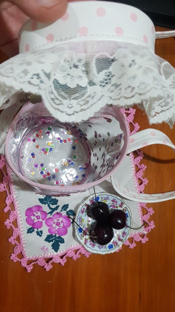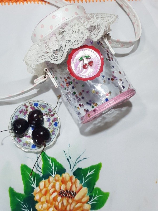 Cartera confeccionada en Cristal Fantasía, y cuerina estampada.